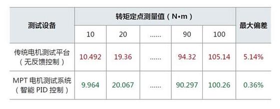 以電(diàn)機特性(xing)曲線測(ce)試爲例(li):用戶設(she)定轉矩(jǔ)爲10~100N•m 時,傳統(tǒng)電機測(cè)試平台(tái)的偏差(cha)高達5%,而MPT 電(diàn)機測試(shì)系統的(de)轉矩控(kong)制誤差(cha)低至0.36%,滿足用(yong)戶對電(diàn)機特性(xing)進行精(jing)準分析(xī)的需要(yào)。