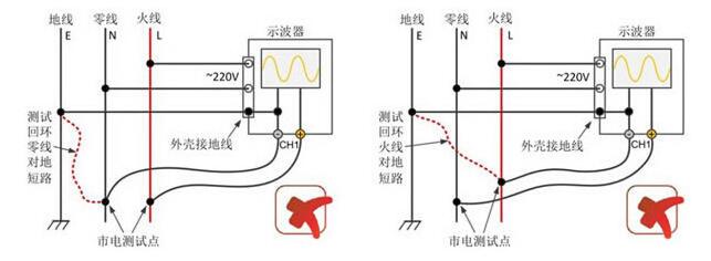 應用(yòng)高壓差分(fen)探頭測量(liang)市電,火線(xiàn)和零線測(ce)試點正反(fan)接都沒關(guan)系,探頭内(nèi)部通過高(gao)阻的方式(shì)将測量端(duān)的地和示(shi)波器的地(dì)隔離開來(lái),不會造成(chéng)短路問題(ti),測量方式(shi)如圖5右所(suo)示。