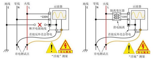 如圖3所(suǒ)示,通過将(jiang)示波器的(de)電源地線(xiàn)人爲斷開(kai)(可以用兩(liǎng)芯電源插(cha)排供電)或(huo)使用隔離(li)變壓器的(de)方法對示(shi)波器供電(dian),達到斷開(kai)測量回環(huán)的目的,實(shí)現“浮地”測(ce)量。