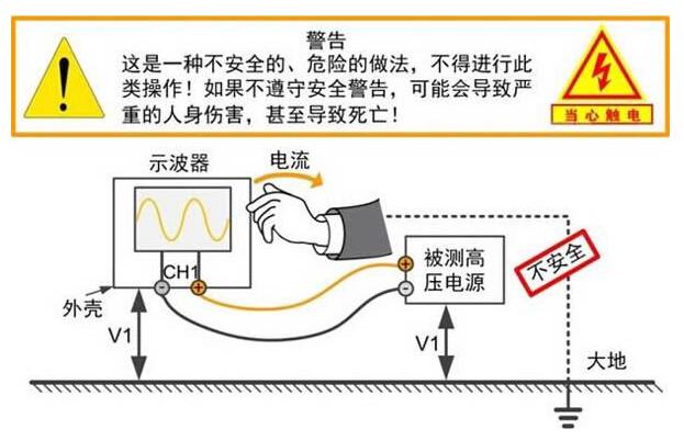 浮(fú)地測量時(shí),示波器外(wài)殼金屬端(duan)和探頭接(jie)地端帶有(yǒu)同等電平(píng)。當測量市(shì)電時,外殼(ke)可能帶有(yǒu)220V的電壓,人(rén)體一旦接(jie)觸到示波(bo)器外殼,電(diàn)流會經過(guò)人體流入(rù)大地,非常(cháng)危險!