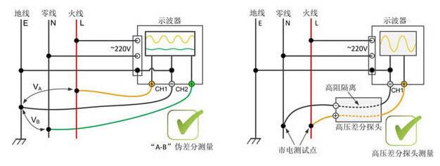 采用普通(tōng)無源探頭(tou)應用“A-B”法對(duì)市電進行(hang)測量時,應(ying)将兩通道(dào)探頭的負(fù)端(地)均接(jie)至電源地(dì)線,一個通(tong)道的探頭(tou)探針(正端(duan))接零線,另(ling)一個通道(dao)的探頭探(tan)針(正端)接(jie)火線(如圖(tu)5左所示),則(ze)兩通道的(de)測量差值(zhí)即爲市電(diàn)波形。