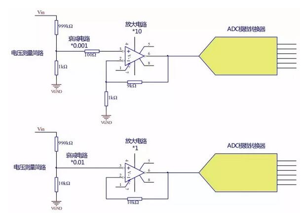 在測量(liang)較小信号時(shí)應使用圖3第(di)二張所示的(de)電路,首先衰(shuāi)減電路進行(háng)較小倍數的(de)衰減,10V輸入時(shí)衰減電路輸(shū)出0.1V,然後放大(dà)電路将有效(xiào)信号放大10倍(bèi)到1V送入ADC取樣(yang)。這樣的處理(li)方式将會顯(xian)著減少噪聲(sheng)、失調和增益(yì)誤差的影響(xiǎng)👉,在包含小量(liàng)程的測量設(she)備中通常會(huì)采用這樣的(de)方式或等效(xiao)的方式進行(hang)處理。