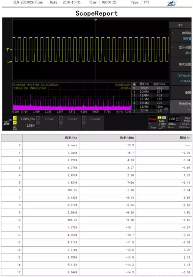 ScopeReport TM功能(neng)可以對所有的(de)協議解碼和FFT的(de)頻譜分析結果(guo)進✍️行“打包”處理(li),自動生成html文件(jiàn)格式的報告,保(bǎo)存在本地💰閃存(cun)和外部存儲器(qi)U盤中,用戶可以(yi)以報表的形式(shì)進行查看,如下(xia)圖3爲FFT網頁㊙️報表(biǎo)。