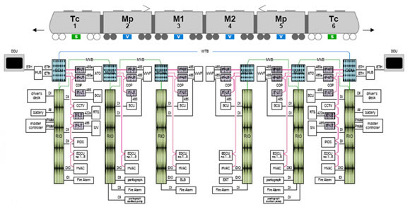 現(xian)場總線拓(tuo)撲結構:如(ru)圖 2所示,爲(wèi)6節編組的(de)地鐵車輛(liang),其中我們(men)測試點位(wèi)于空調控(kong)制器CAN接口(kou)位置,主要(yao)測試這段(duàn)CAN總線的信(xin)号通訊質(zhì)量。