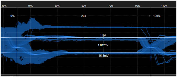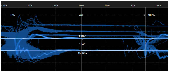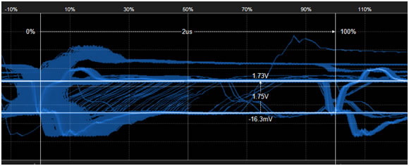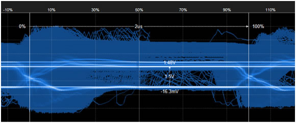 通(tōng)過【眼圖時(shi)間測量】,對(duì)全部波形(xíng)做眼圖,測(cè)量結果可(ke)見波形邊(bian)沿過緩,有(you)部分波形(xing)上升沿有(you)較大的振(zhèn)鈴,下降沿(yan)有較大的(de)地彈現象(xiàng),說明總線(xian)上有信号(hào)不連續的(de)部分。差分(fèn)電平幅值(zhí)爲 1.5V小于标(biao)準的2.0V的ISO11898-2标(biao)準。