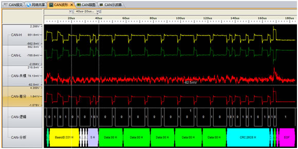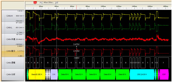 分析: CAN差(chà)分波形邊(biān)沿陡峭,邊(biān)沿清晰,但(dan)幅值隻有(yǒu)1.5V,比标準CAN差(cha)分電平(兩(liǎng)個120歐終端(duan)電阻時)的(de)2.0V少0.5V,有兩種(zhong)可能: