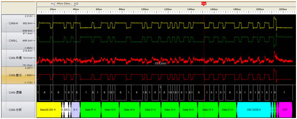 CAN主(zhu)控發出的(de)CAN幀ID爲0x200,0x231。選取(qǔ)其中一個(ge)ID爲0x200的報文(wén),波形如圖(tú)6所示
