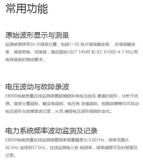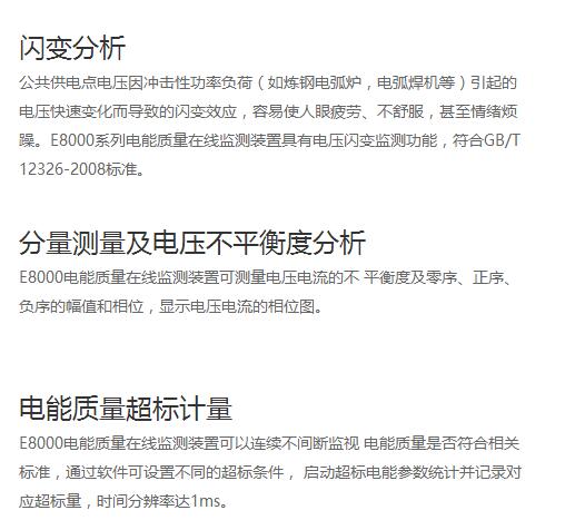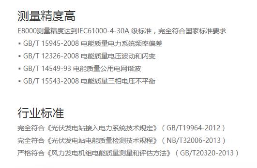 标準支(zhī)持:IEC61000-4-30 A級标準/IEC61000-4-7諧波測(ce)量/EC61000-4-15閃變測量/行業(yè)領先測量精(jīng)度0.1%