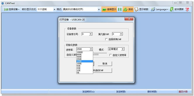 1.選(xuan)擇設備波特率、通(tōng)道号、工作模式啓(qi)動CAN卡