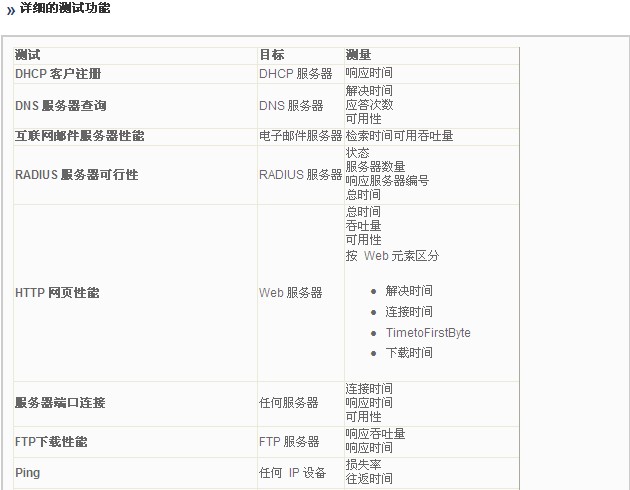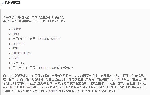 使用應用(yong)程序庫測(cè)量 實際的(de)應用程序(xù)性能,包括(kuo) HTTP、FTP、DNS、電子郵件(jian)、VoIP、ping 或使用靈(líng)活設置定(dìng)義您的應(yīng)用程序性(xìng)能